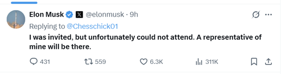 对此,马斯克回应称,他受邀参加周四在白宫新装修的玫瑰园举行的科技领袖峰会,但无法出席。